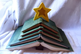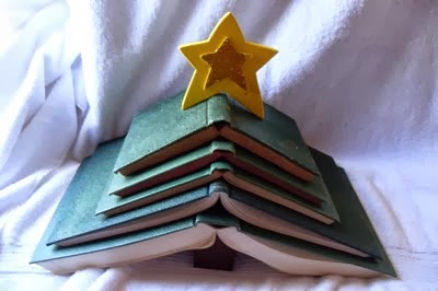 Εδώ βλέπετε τα βιβλία τοποθετημένα με κλίμακα μεγέθους που η μεγαλύτερη ξεκινάει από την βάση, την οποία αποτελεί ένα μικρό κομμάτι ξύλου ή ένα κουτί, και καταλήγει στην μικρότερη που βρίσκετε στην κορυφή ,ενώ τα στολίζει ένα αστεράκι από τσόχα...