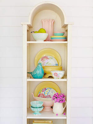 Αν διαθέτετε εμφανή ράφια ή μια βιτρίνα με τζάμι στο καθιστικό, στην τραπεζαρία, ή την κουζίνα σας, τοποθετήστε μερικά οικιακά σκεύη σε ανοιχτούς χρωματικούς τόνους,και μετατρέψτε μια κανάτα σε ανθοδοχείο!