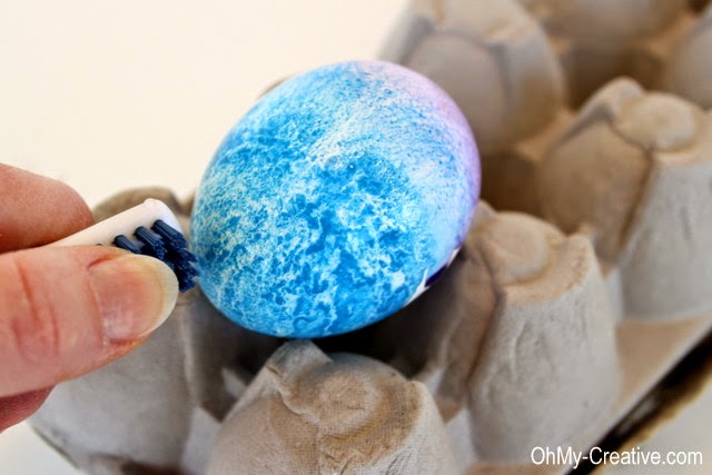 ...ενώ μια παραλλαγή της ιδιας ιδέας είναι αφού χρωματίσετε τα αυγά με νερομπογιές, να "περάσετε" την επιφάνεια με μια καινουργια αλλά βρεγμένη οδοντόβουρτσα που θα δημιουργήσει  διαφορετικού σχήματος σχέδια...