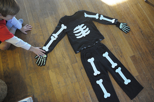 Την ιδέα με το πλαστικοποιημένο χαρτί μπορείτε να την εφαρμόσετε και σε στολή ΣΚΕΛΕΤΟΥ. Το μόνο που έχετε να κάνετε είναι να τυπώσετε... κόκαλα, και να τα πλαστικοποιήσετε να κάνετε μικρές τρυπούλες στις άκρες και να τα τοποθετήσετε πάνω σε μαύρα ρούχα με μικρές παραμάνες...Εναλλακτικά δημιουργήστε ένα scull t-shirt ακολουθώντας  τις οδηγίες της ανάρτησης https://styleitchic.blogspot.com/2015/02/last-minute-costume-diyskeleton-t-shirt.html