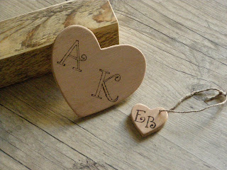 ...ή οικολογικά στολίδια όπως αυτές οι χειροποίητες ξύλινες καρδιές στις οποίες μπορείτε να επιλέξετε μια λέξη ή κάποια αρχικά τα οποία θα χαραχτούν ειδικά για σας με την μέθοδο της πυρογραφίας...