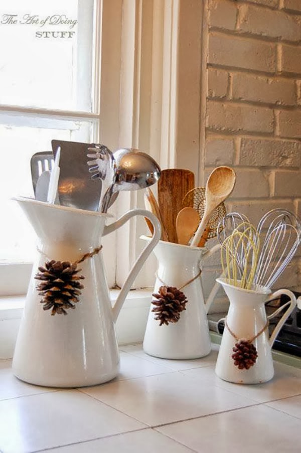 Ανανεώστε με φθινοπωρινούς καρπούς μικρές γωνιές όπως τις διακοσμητικές κανάτες ή τα σκεύη της κουζίνα στολίζοντας τα με κουκουνάρια...