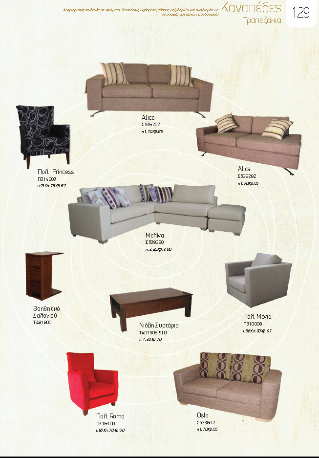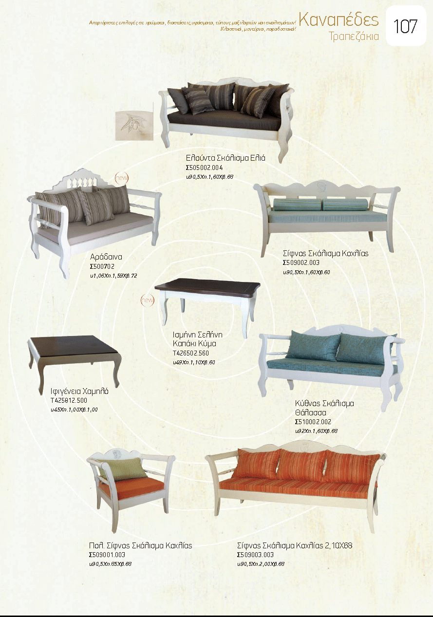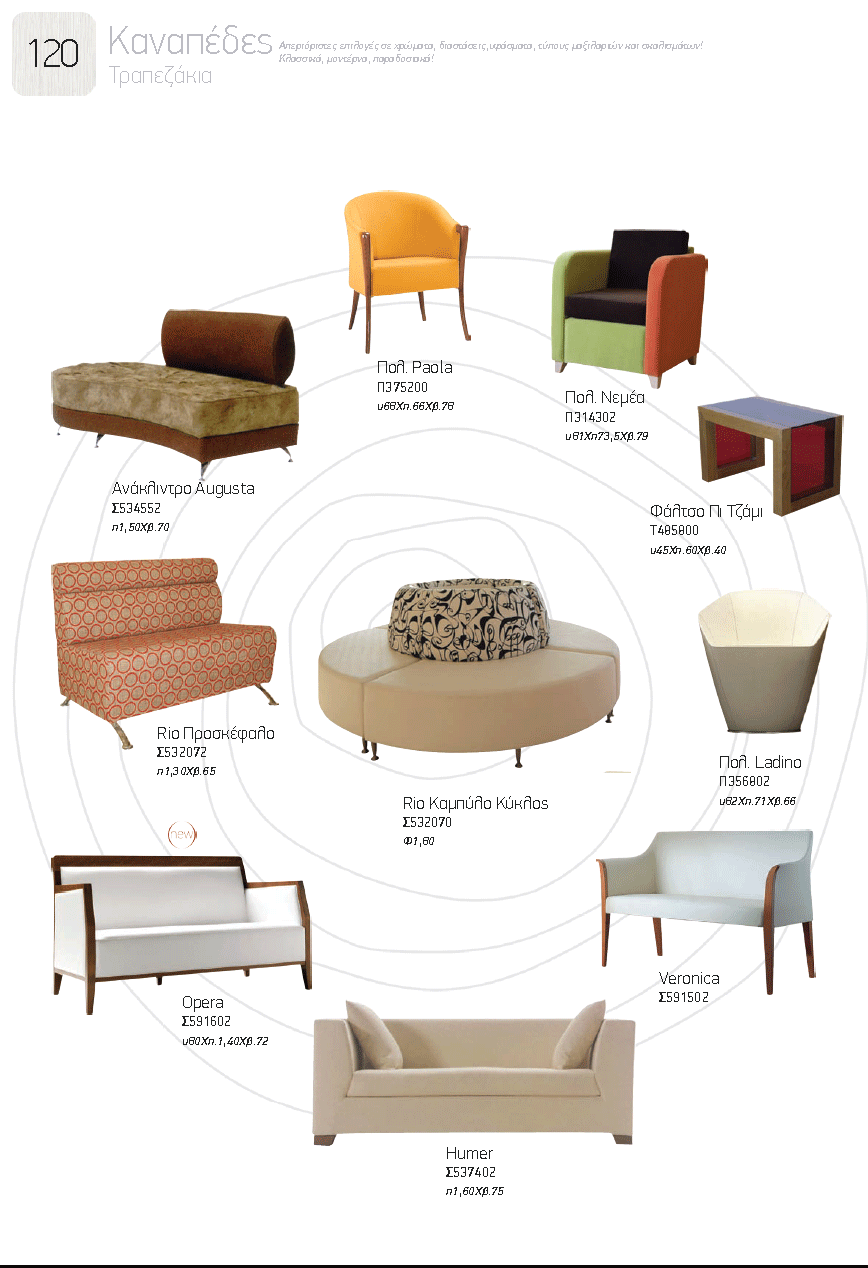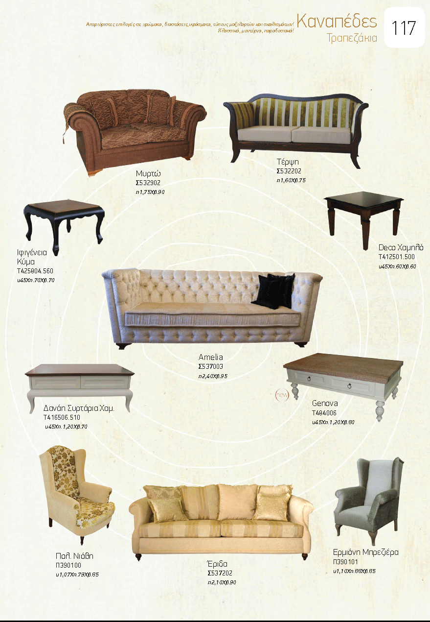 Η σωστή επιλογή του στυλ καναπέ που θα τοποθετηθεί στο σαλόνι, καθιστικό ή οποιοδήποτε άλλο δωμάτιο δεν πρέπει να γίνεται μόνο σε σχέση με την τιμή, μια και λόγω του ότι αποτελεί ένα από τα πιο ογκώδη έπιπλα του χώρου, συνήθως καθορίζει και το στυλ διακόσμησης που θα ακολουθηθεί σε σαλόνι ή ενιαίο χώρο... Επιλέξτε από τον παρακάτω κατάλογο καναπέδες που σας αρέσουν, σημειώστε τους κωδικούς και στείλετε τους μαζί με φωτογραφίες του χώρου που θα τοποθετηθούν με ένα πρόχειρο σκίτσο που αναφέρει τις διαστάσεις, στο styleitchicshop@yahoo.com